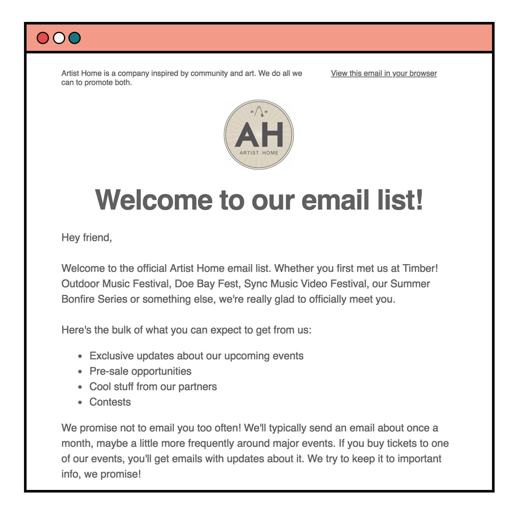 Here’s an example of a welcome email from Artist Home, the organization that produces events in the Pacific Northwest.