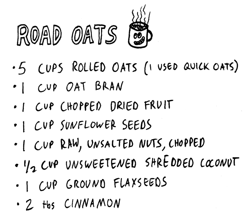 • Oatmeal is a magic food for pregnancy. It’s healthy and full of fiber, which will help stave off the constipation that commonly results from pregnancy hormones and all the pressure your growing uterus puts on your intestines. Below is a recipe from a doctor friend that I altered a bit to suit my taste, and whipped up a big batch to take on tour. It’s great because you can just throw some in a mug and add hot water, which you can usually find next to the coffee machines at any gas station.